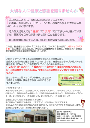 総合健診センター「コスモ」では、コースに合わせた”人間ドックギフト券”をご準備しております。