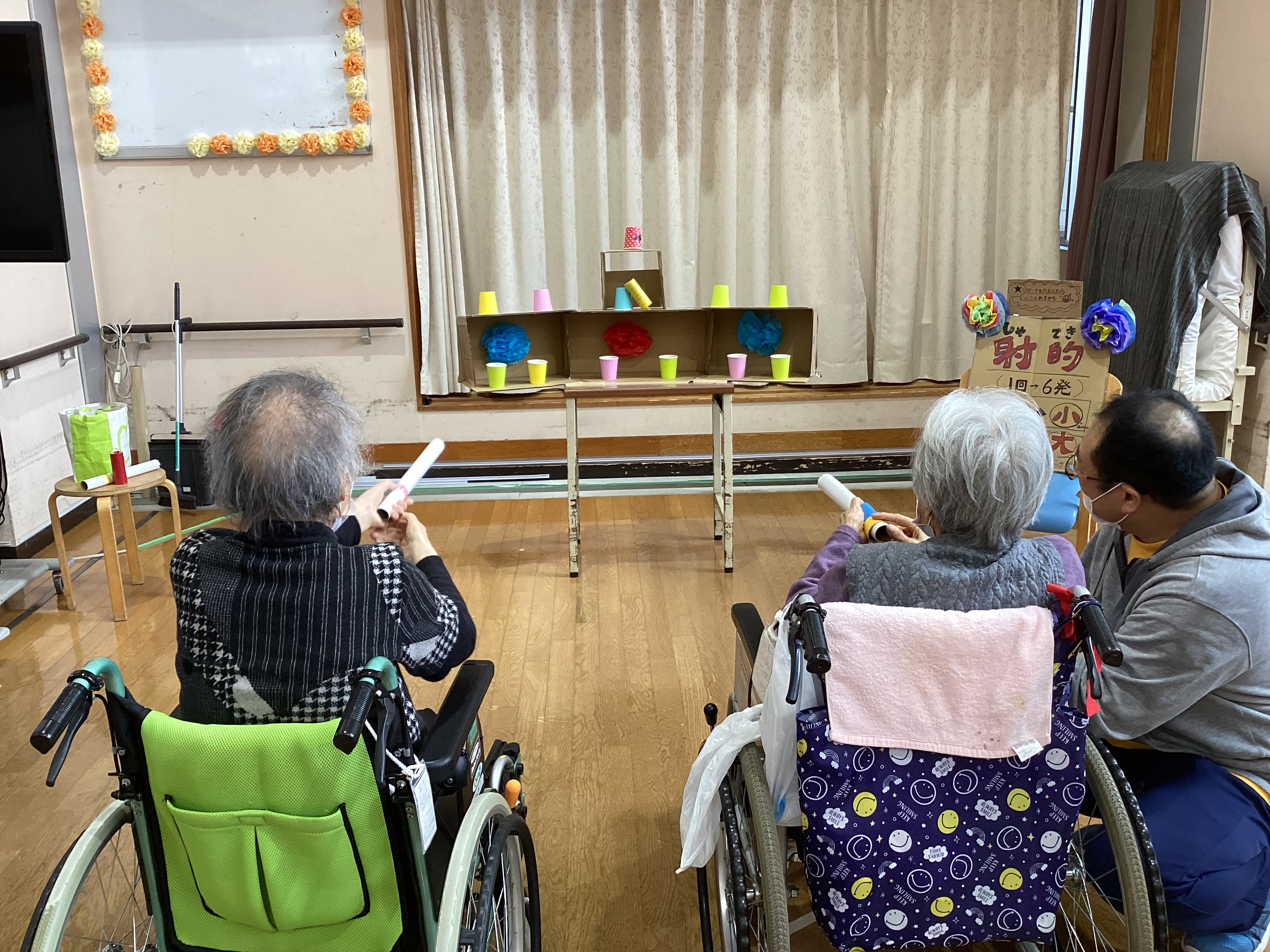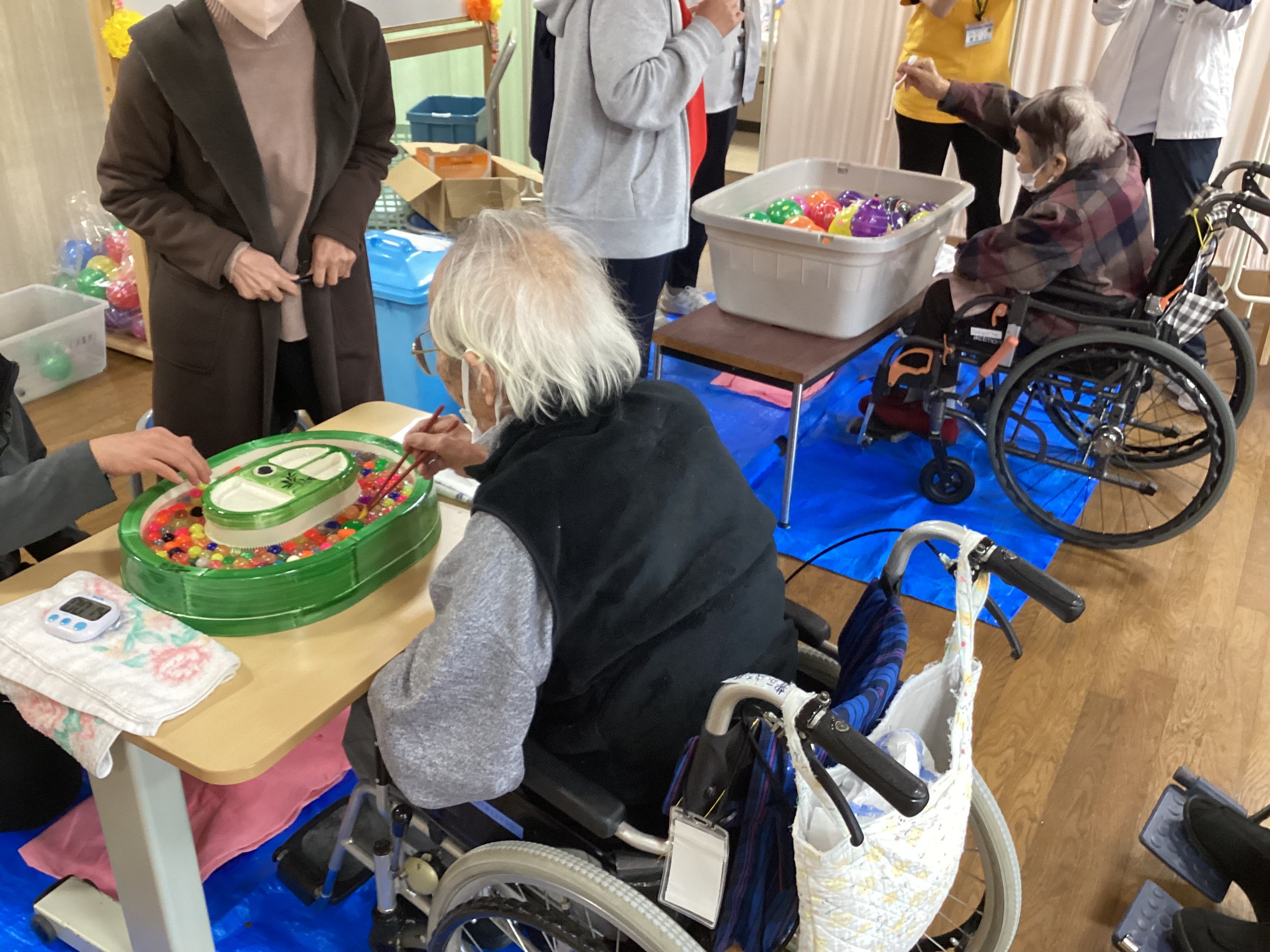 お祭り定番のヨーヨー釣り・スーパーボールすくい・射的など職員が高齢者向けに工夫したものを、利用者様が楽そうに何度も何度も挑戦されていました。